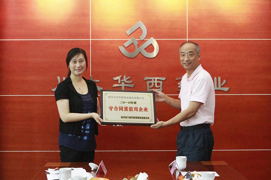 7月20日,四川省工商行政管理局直属分局郝力副局长一行到公司进行“守合同重信用企业”现场验收检查。公司领导向郝局长一行汇报了公司在合同管理方面的制度以及合同执行等情况。郝局长对公司在合同管理及合同信用方面所开展的工作表示了充分肯定,希望公司再接再厉争取更好的成绩。验收合格后,郝局长现场向公司颁发了“守合同重信用企业” 荣誉证书及牌匾。