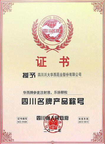 我公司华西牌参麦注射液、乐脉颗粒在2009年获四川省人民政府授予的“四川名牌产品”称号,2012年经复查确认再次荣获第十届“四川名牌产品”称号。 “产品如人品,质量是生命”,公司将继续强化品牌意识,狠抓产品质量,不断提高产品质量水平,以更多优质的产品服务于社会。