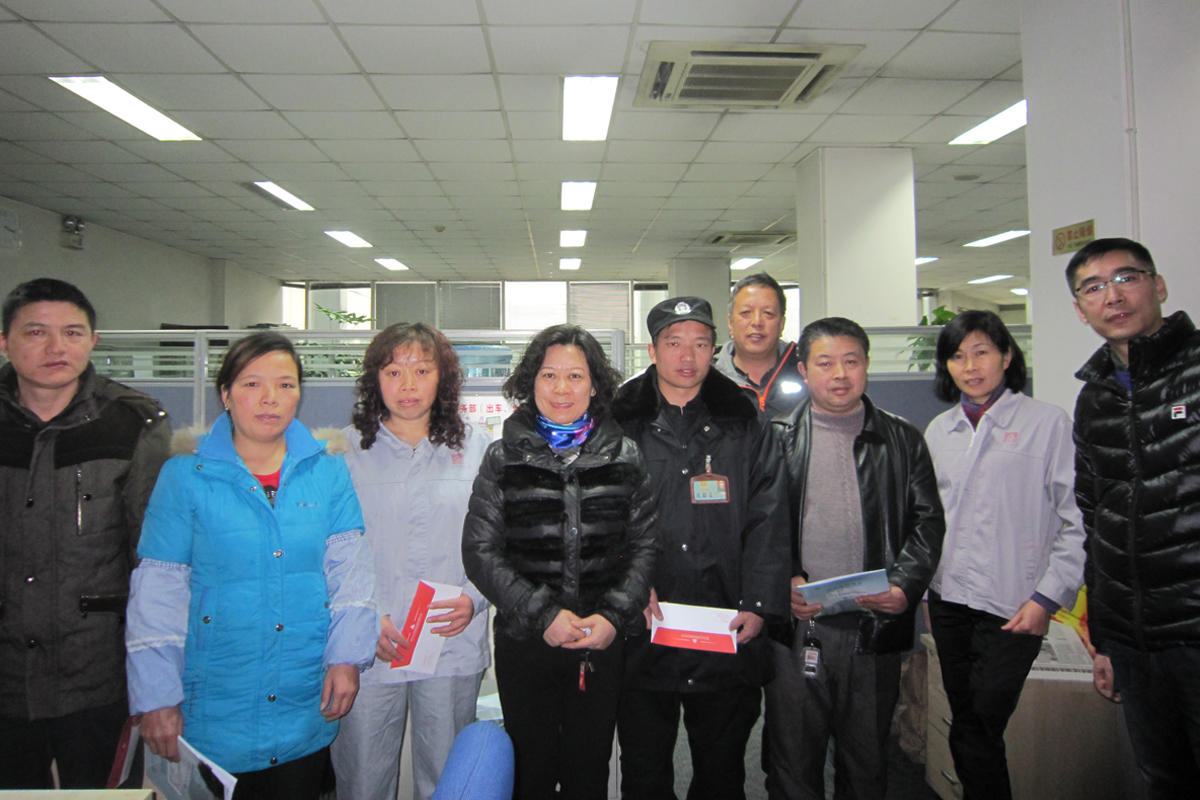 2015年春节前夕,公司董事长兼总支书记金莎丽同志率领工会主席刘兴萍、副主席刘彬、人力资源部部长袁泉等,组成党、政、工慰问团对公司23名困难职工进行了慰问。慰问团深入部门、车间,为困难职工送去了公司的关怀和新春的祝福以及慰问金。同时勉励大家增强信心,通过自身努力逐步改善现有的困难状况,与公司一起共同发展。