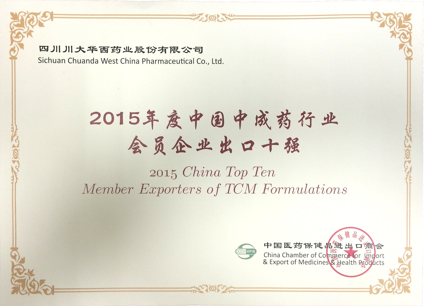 年度中成药出口名列全国第六。为表彰公司在推动中国医药健康产业国际化进程中做出的杰出贡献,中国医药保健品进出品商会对公司进行了表彰,并授予“中成药行业出口十强”称号。