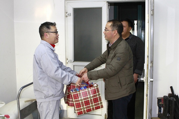 2018年2月15日一早(农历大年三十),痴女 总经理杜江在工会、总经办干部的陪同下,看望慰问了春节期间依然坚守在工作岗位的保安、公用系统水站、空调机组、配电等班组员工,并向他们致以新春的祝福和节日的问候。