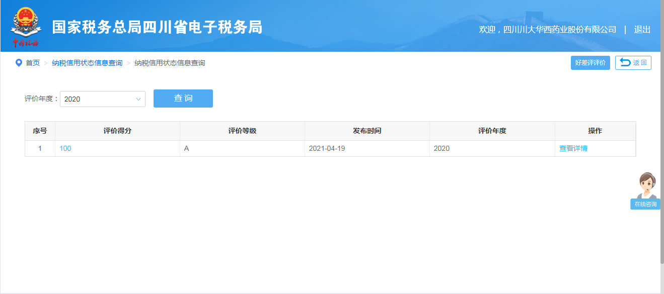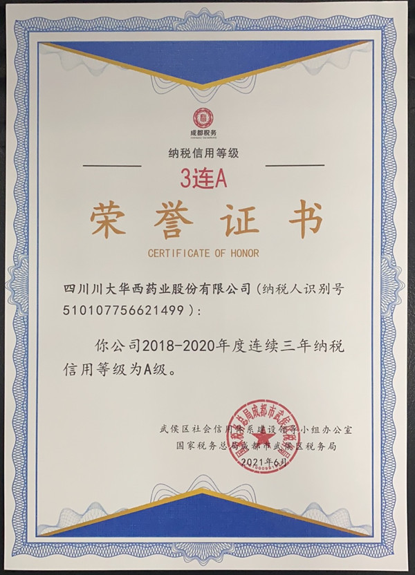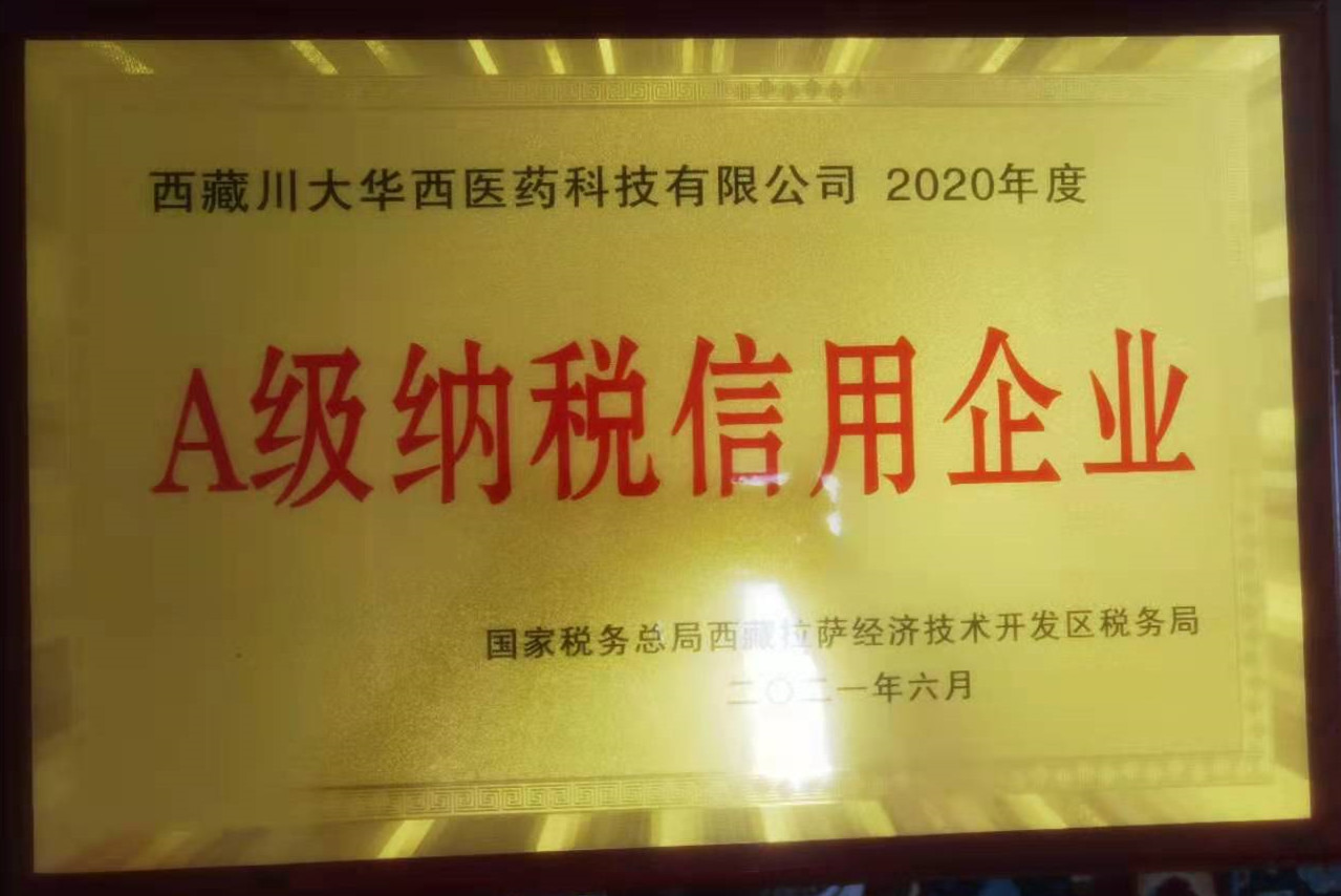 同期,2021年6月,痴女 全资子痴女 西藏川大华西医药科技有限痴女 ,通过国家税务总局西藏拉萨经济技术开发区税务局2020年度纳税人信用等级评定,获得了“A级纳税信用企业”证书(拉萨经济技术开发区企业6000多户,获此荣誉的企业仅有150户)。
