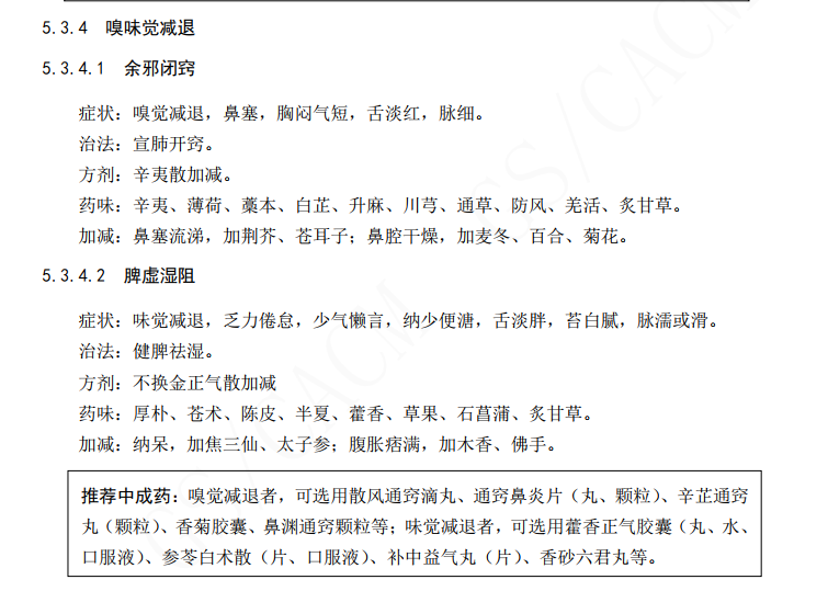 在共识中,推荐通窍鼻炎颗粒用于“嗅觉减退者”。嗅觉减退被共识归为“余邪闭窍”,其症状主要是“嗅觉减退,鼻塞,胸闷气短”。